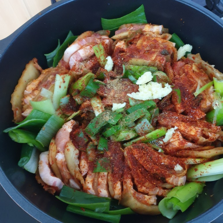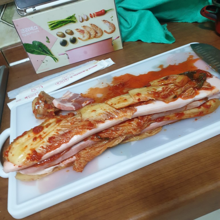 김치-삼겹-김치-삼겹 쌓아서 자르기