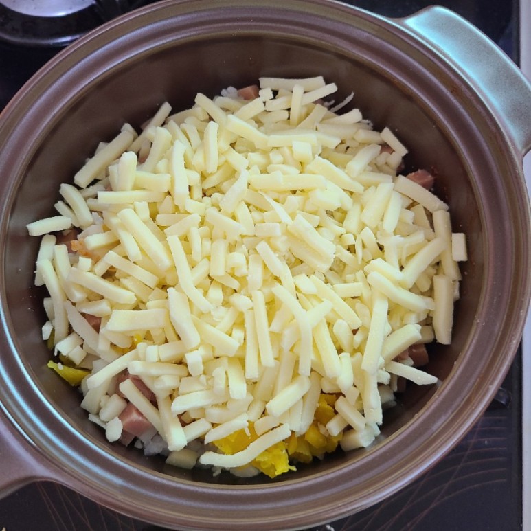 사진은 못찍었는데 그 위에 케찹 0.5, 고추장 0.5 (큰숟가락 기준) 올려주고 치즈로 덮어줬어요!