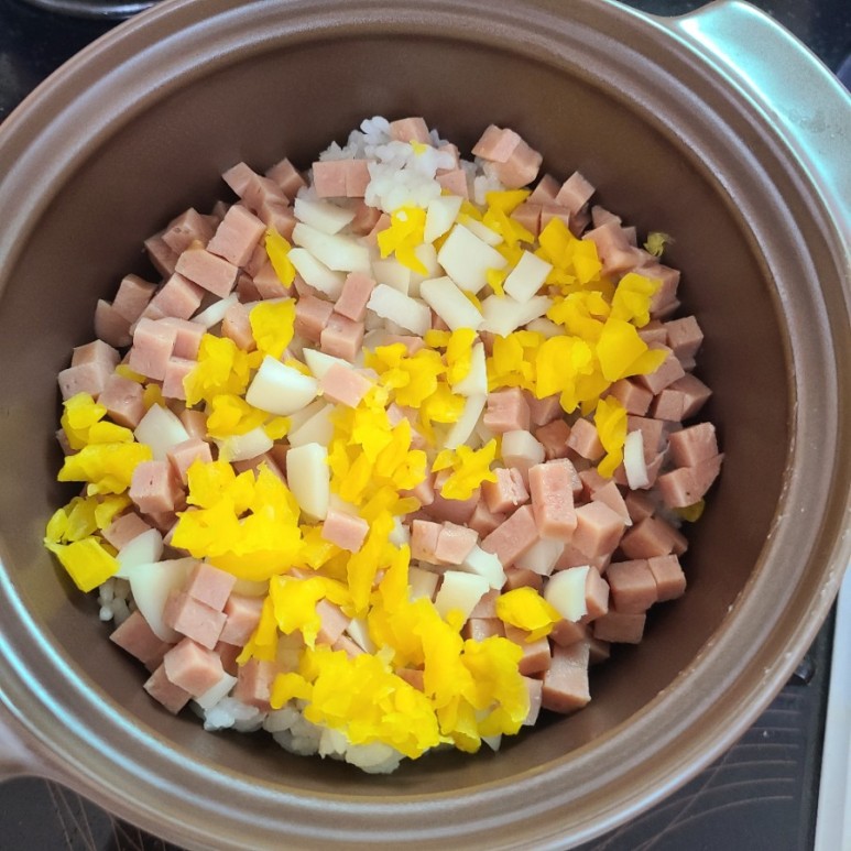 스팸, 단무지, 떡국떡을 잘게잘게 잘라서 올렸어요! 양파아니에용.. 떡이에요..