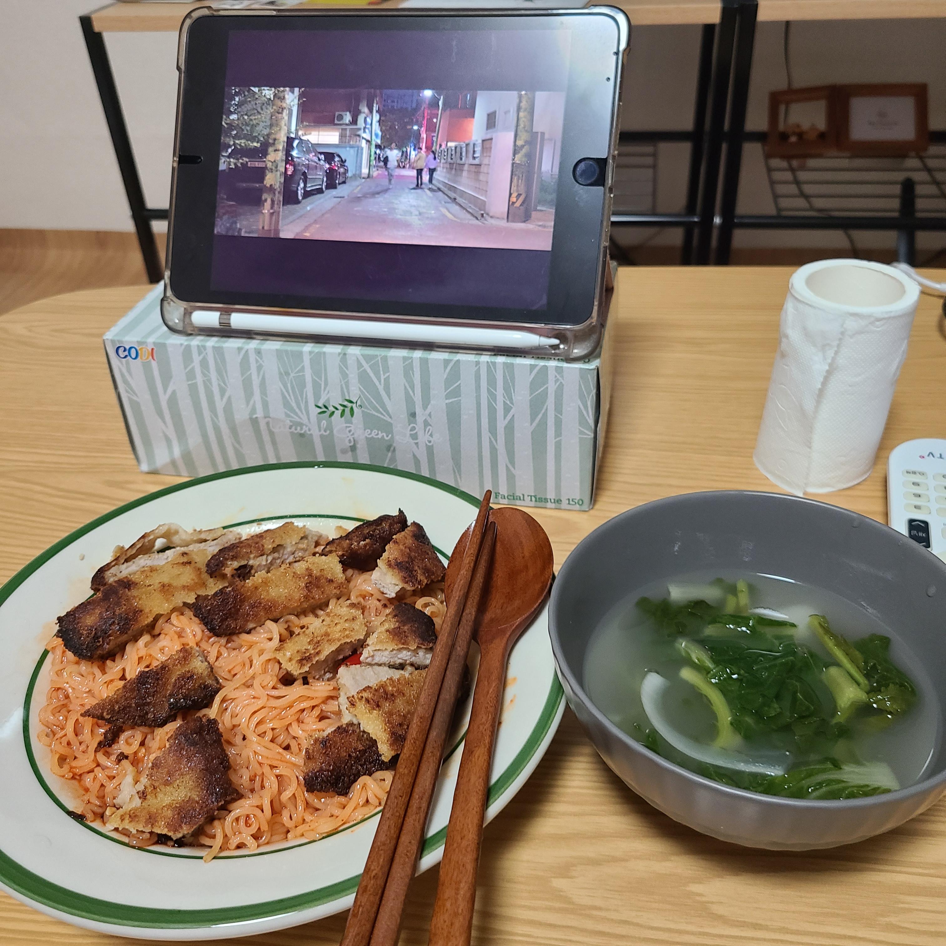 만들어놨던 돈까스가 냉동실에 2장 남았길래 한 장 튀겨서 같이먹었는데 완전 성공적인 조합이었다ㅋㅋㅋㅋ